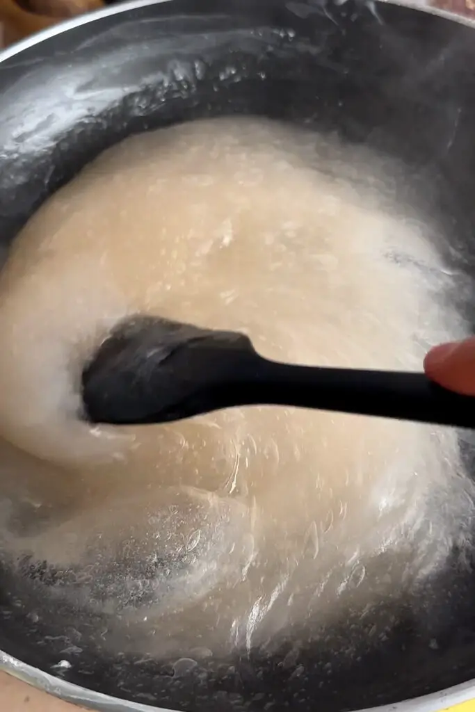 - Add all mochi ingredients to a pot. Mix thoroughly with a rubber spatula to ensure no lumps. Stir constantly over low-medium heat. The mixture will start to thicken. Continue stirring until the mixture turns translucent/semi-clear (~10min).