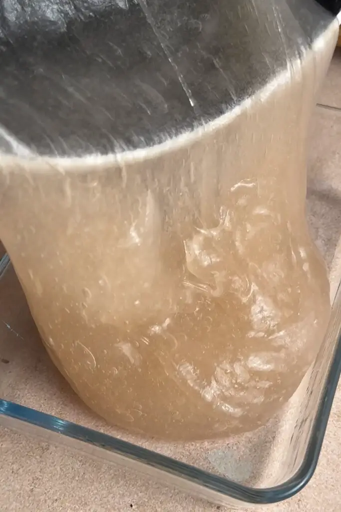 - Pour mochi into a lightly oiled pan (I'm using a glass dish that is roughly 14x18cm), cover and refrigerate around 3 hours or overnight.