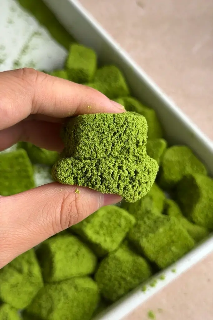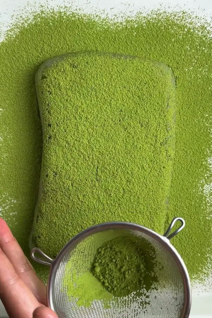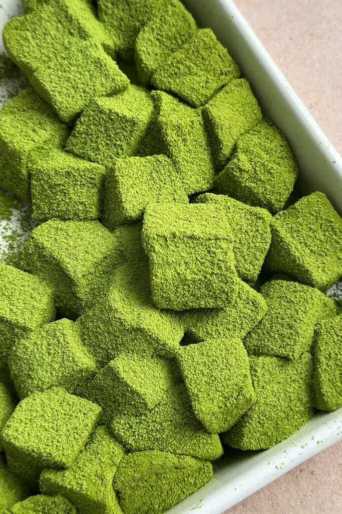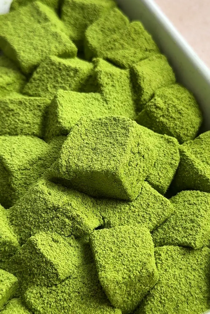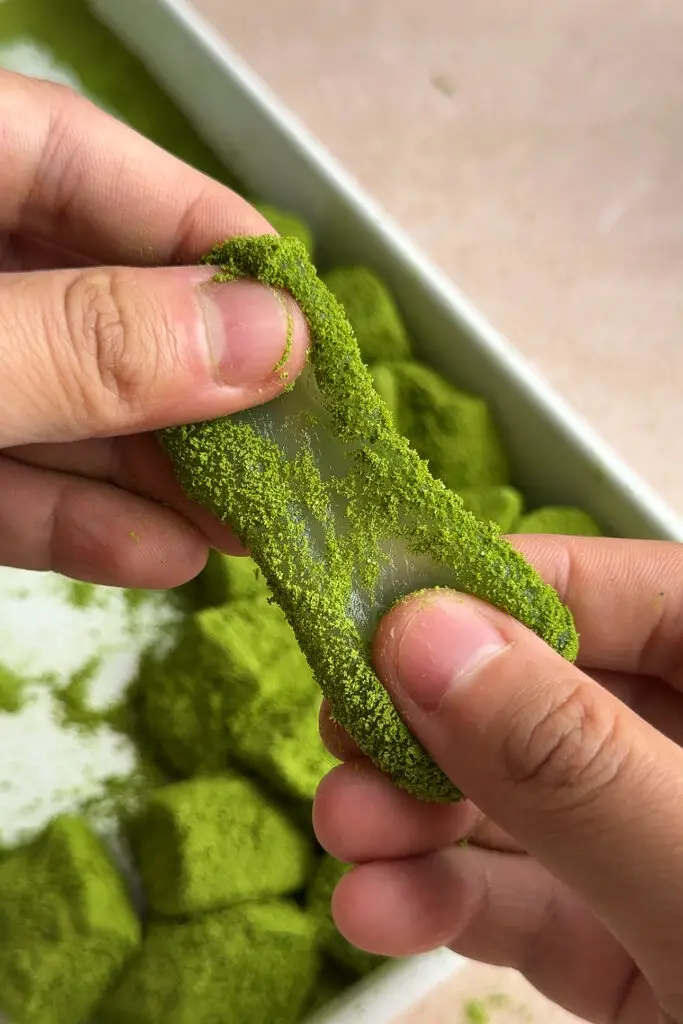 - Once mochi has set, in a small bowl mix together kinako powder, matcha, and powdered sugar. Sift some of the mixture onto a cutting board or pan. Gently remove the mochi and place on top of the powder. Dust more powder on top and cut mochi into cubes. Finally, roll in more powder.