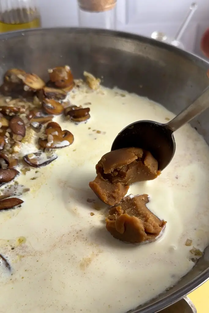 - In a large pan, heat olive oil over medium heat. Add mushrooms and fry until golden brown. Add in shallots and garlic, then sauté until translucent. Push everything to one side, on the empty side add butter, miso, and cream. Stir until the miso has dissolved completely.