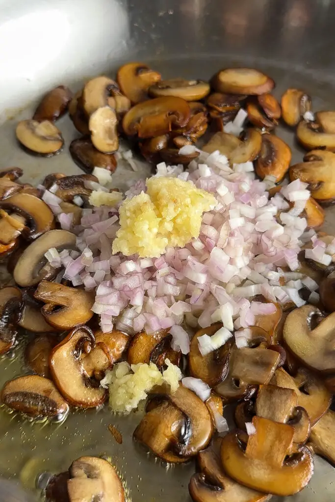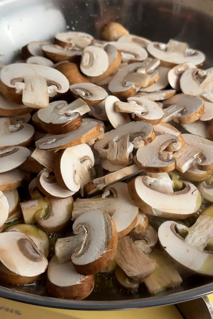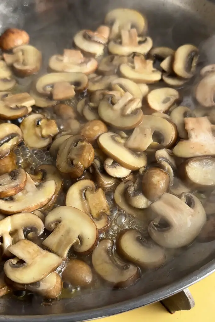 Sauté the mushrooms – Heat olive oil in a large pan over medium heat. Add sliced mushrooms and cook until golden and slightly crispy on the edges.