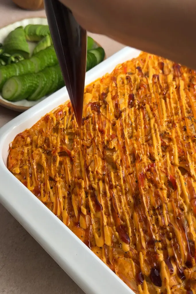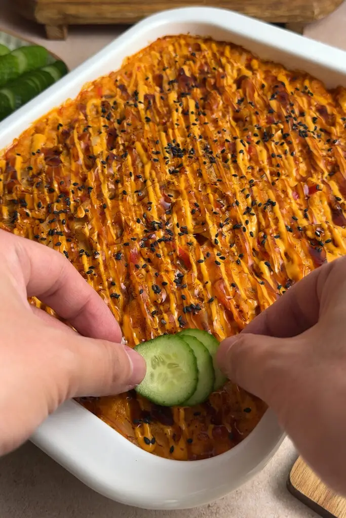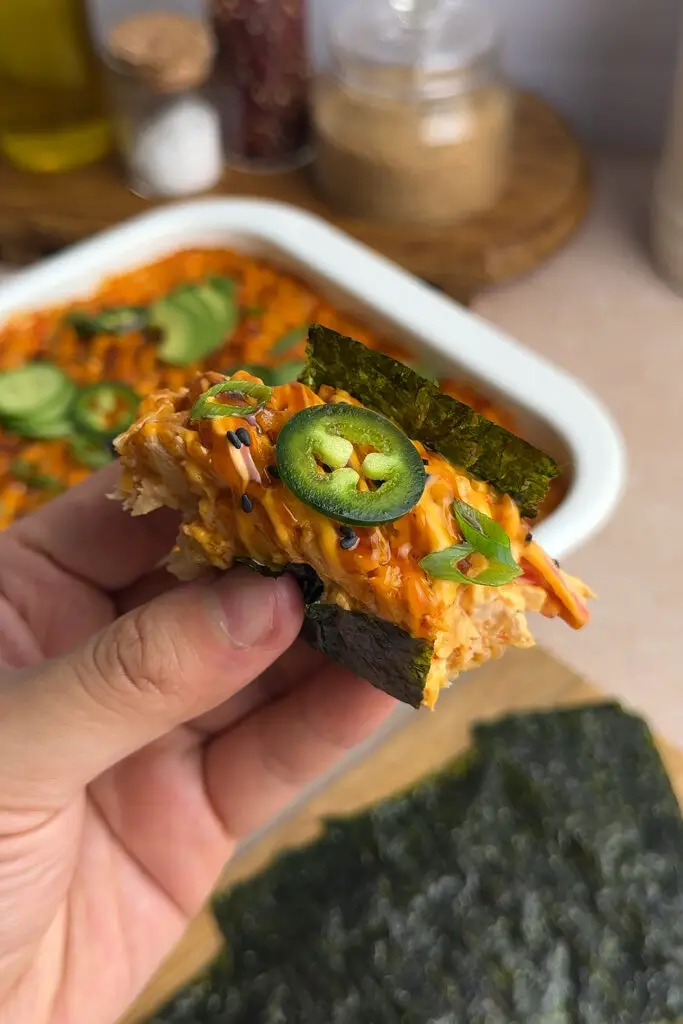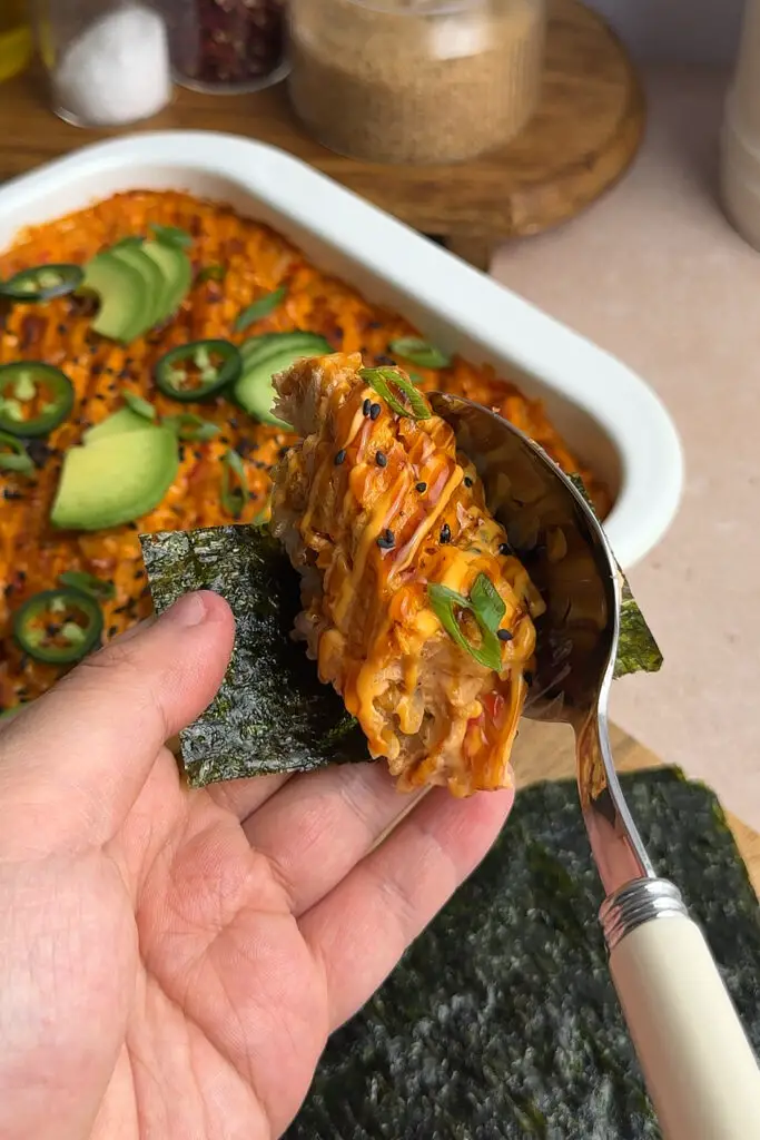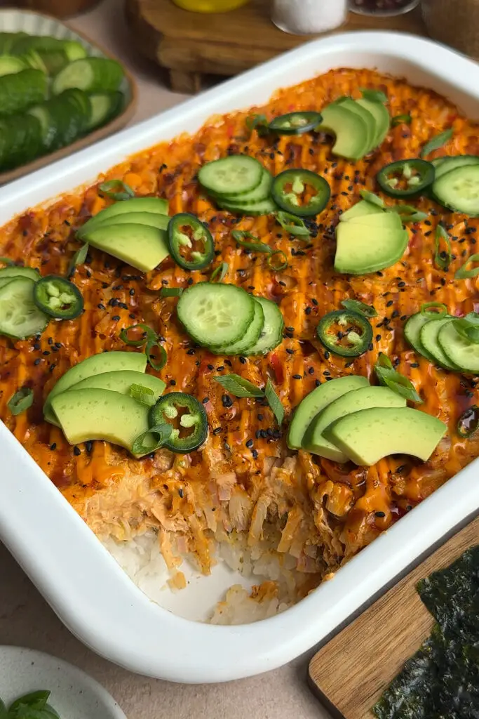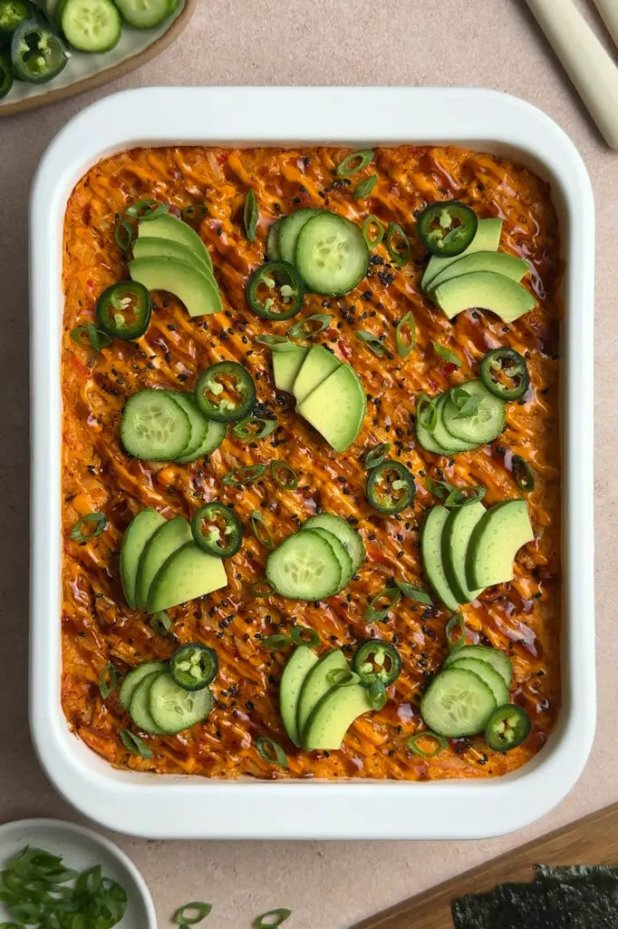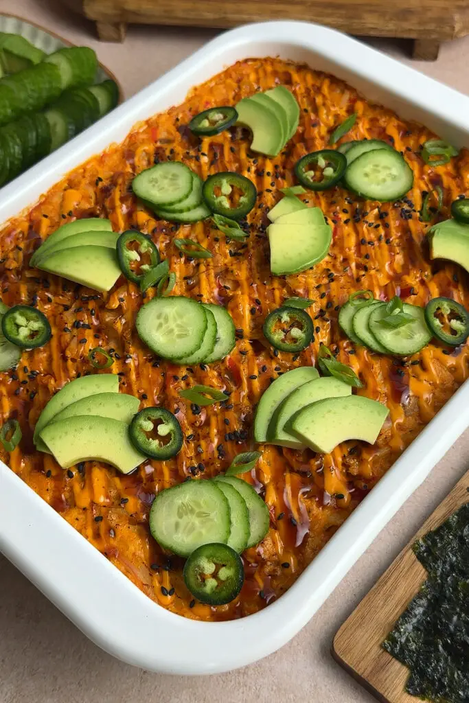A sushi bake is a deconstructed, casserole-style version of a traditional sushi roll. Instead of rolling seaweed and rice by hand, everything is layered into a baking dish and heated until warm, creamy, and delicious. You scoop it onto roasted seaweed sheets and enjoy it like a sushi-inspired dip. It’s beginner-friendly, fun to serve, and ideal for feeding a crowd.