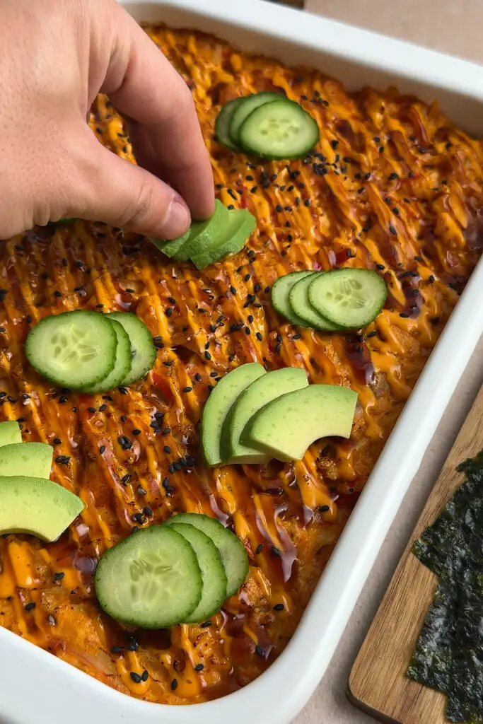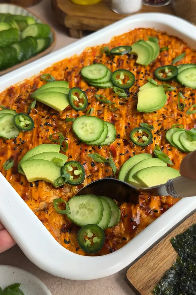 For the best texture, let the sushi bake rest for 10–15 minutes before serving. This helps the layers set and makes scooping onto seaweed sheets much easier - perfect for party platters!