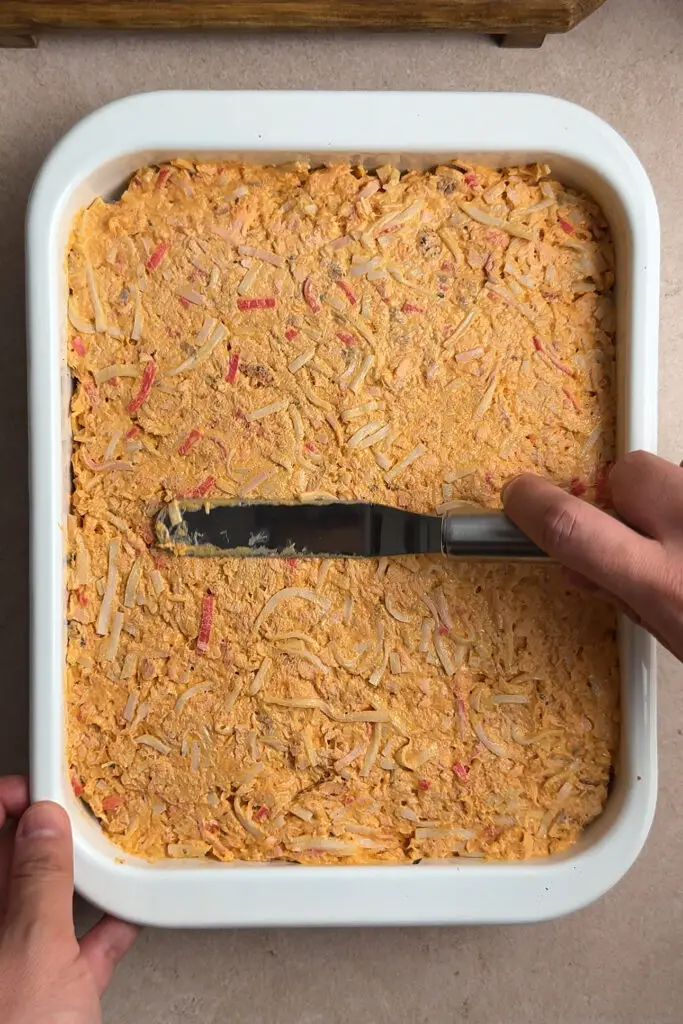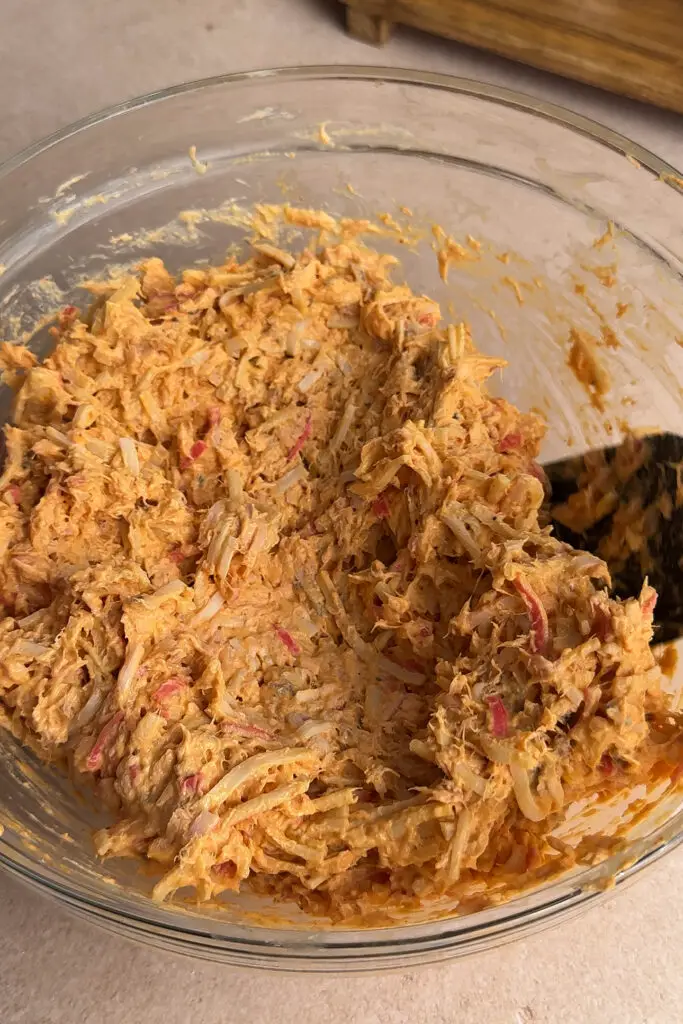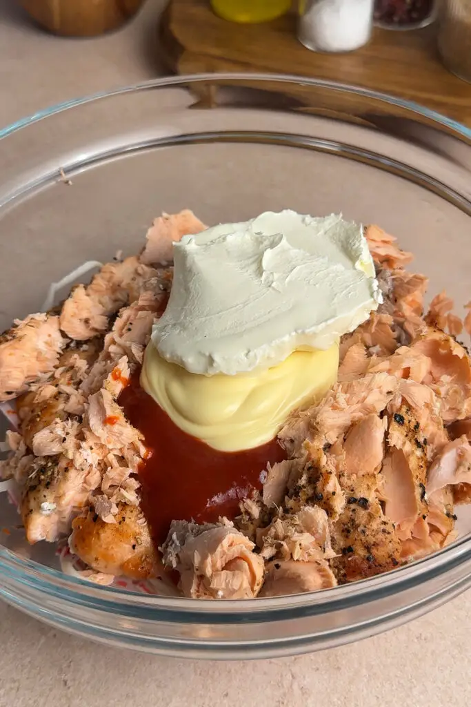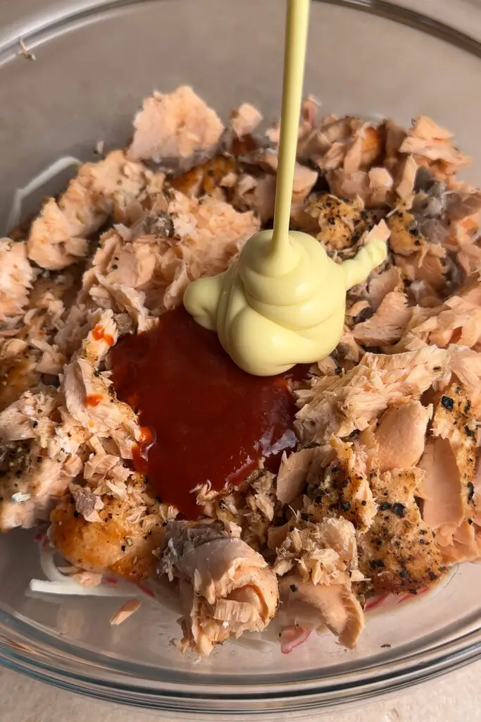 - Preheat oven to 190C. In a large bowl mix together shredded imitation crab, salmon, cream cheese, sriracha, and Japanese mayo. Using a fork to break up the salmon. Season with salt and pepper to taste.