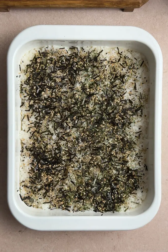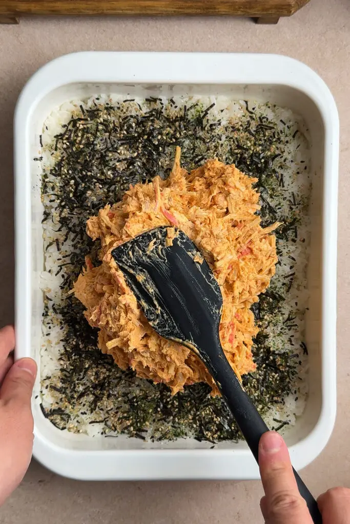 Sprinkle a generous layer of furikake over the rice. Spread the crab-salmon mixture evenly on top.