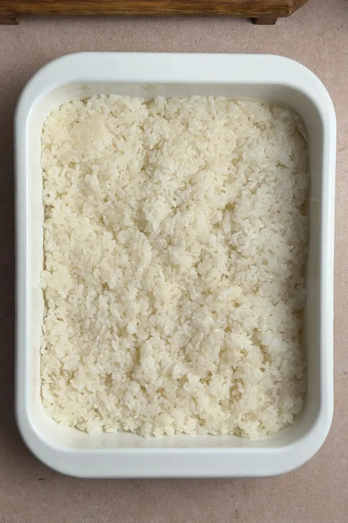 - In a medium bowl mix together cooked rice and sushi vinegar. Gently press the rice into a 20x25cm rectangular baking dish.
