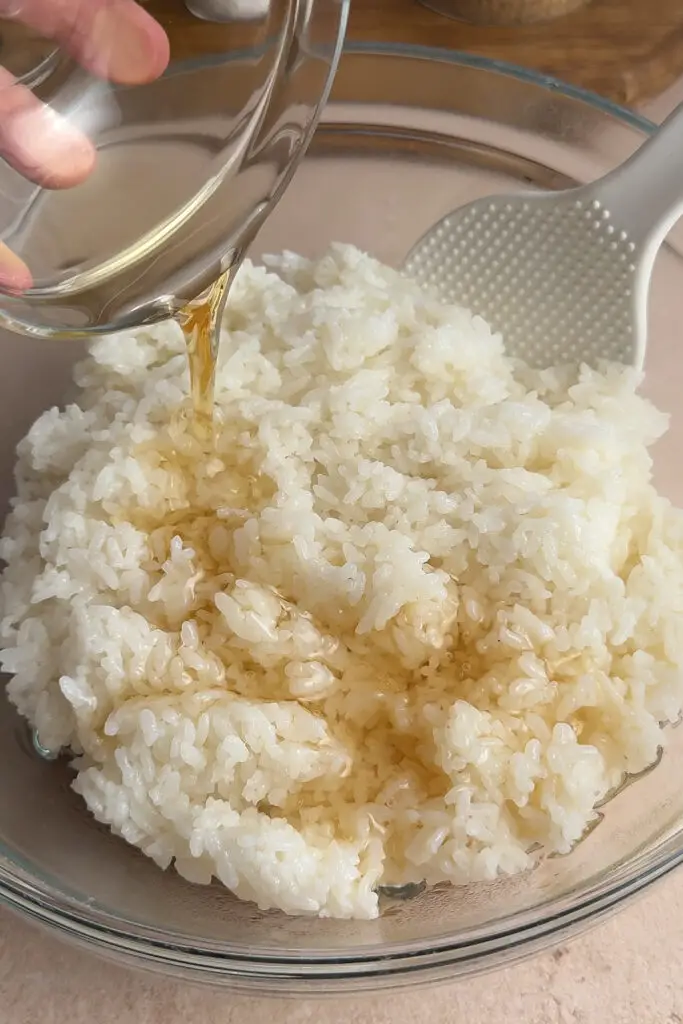 In a separate bowl, gently mix the cooked rice with sushi vinegar. Press the rice evenly into a 20×25 cm baking dish.