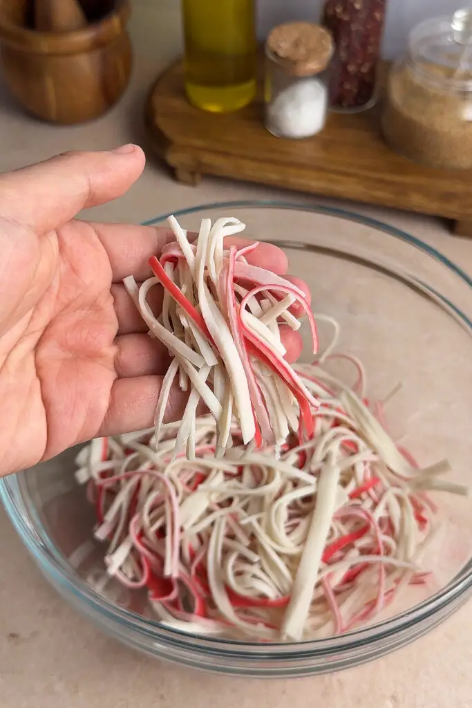 - Imitation crab – sweet, mild seafood that mixes easily into the creamy topping.