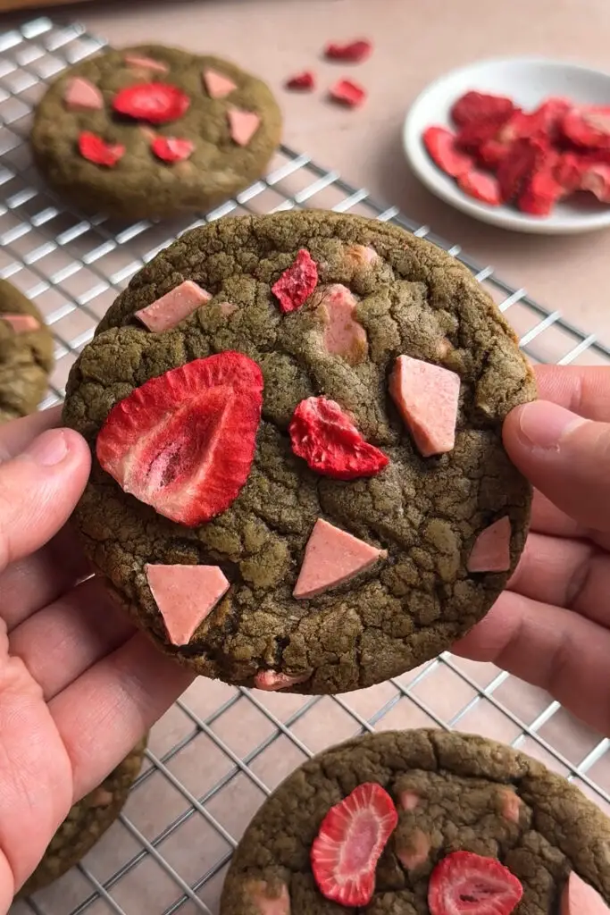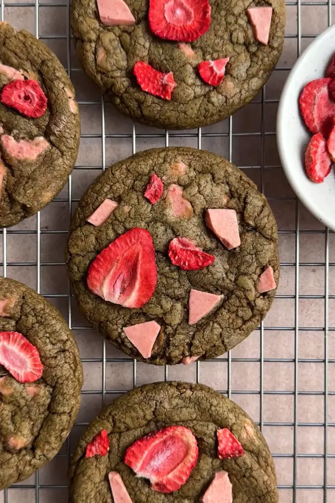 These brown butter strawberry hojicha cookies are inspired by cozy strawberry hojicha lattes - nutty, gently sweet, and deeply comforting. They combine caramelized brown butter, earthy hojicha tea, and pops of fruity strawberry white chocolate for a cookie that feels both familiar and a little special. If you love café-style flavors and not-too-sweet desserts, this recipe is for you.