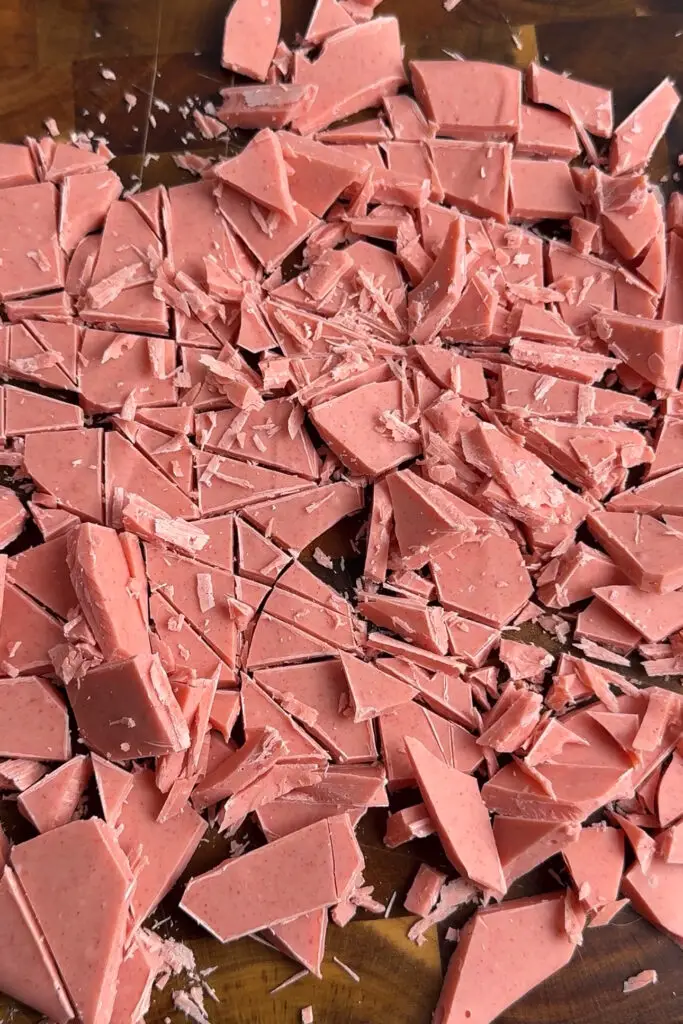 Preheat the oven to 175°C / 350°F. Add the freeze-dried strawberries to a spice grinder and blend into a fine powder. Mix the strawberry powder into the melted white chocolate. Spread the mixture thinly on a silicone-lined sheet and refrigerate or freeze until solid, about 10 minutes.