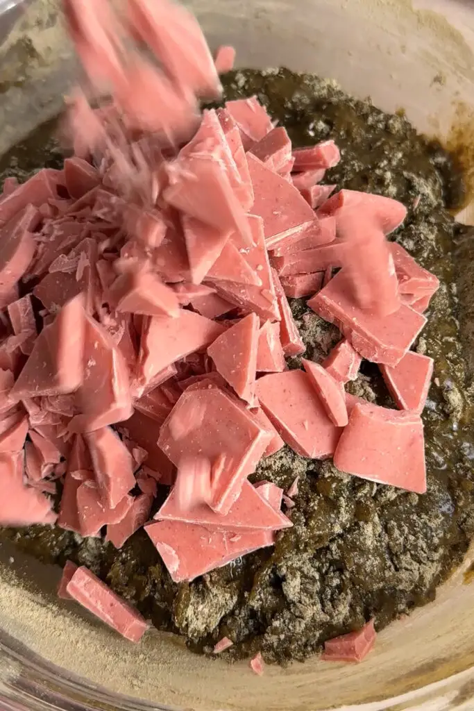 - In the meantime, whisk together flour, hojicha powder, baking soda, and salt. Chop the strawberry chocolate into small/medium chunks. Reserve about ¼ of the chocolate for the top.
