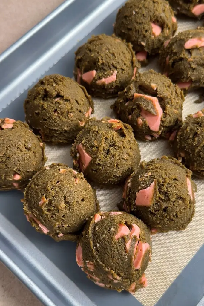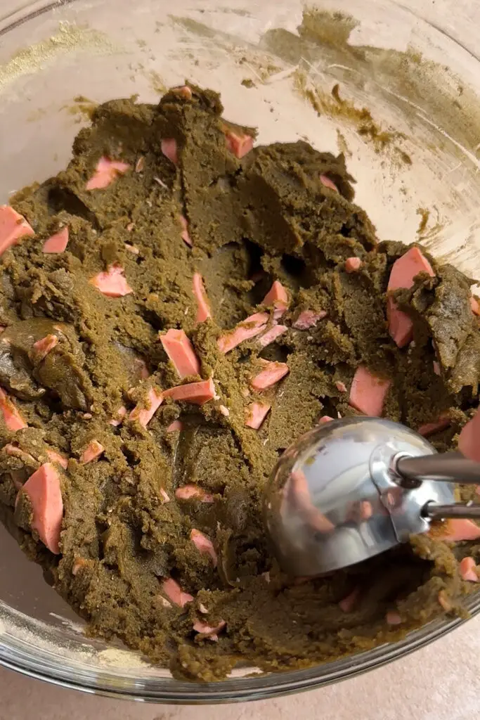 - Add the dry ingredients to the wet and combine. Then fold in strawberry chocolate. Scoop onto a parchment lined baking sheet and press in extra pieces of chocolate.