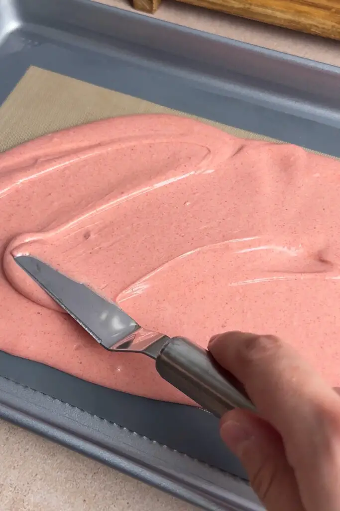 - Preheat the oven to 175C/350F. Add freeze-dried strawberries to spice grinder and blend to a fine powder. Add the strawberry powder to melted white chocolate and mix. Spread thinly on a silicone lined sheet and refrigerate/freeze until solid, around 10 minutes.
